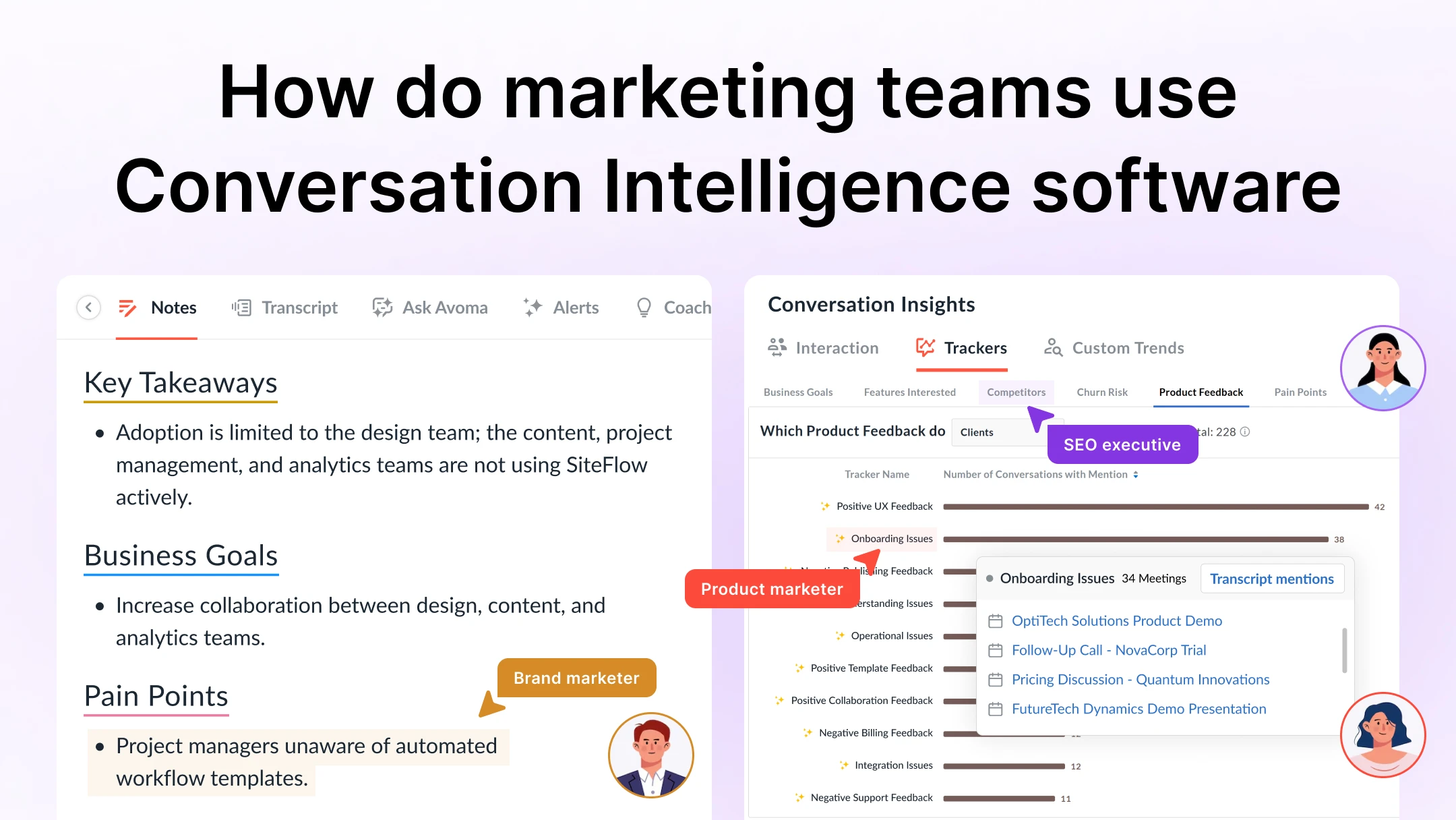 Further you can also save these best moments and meetings to curated playlists for instantly sharing the voice of the customer with the product team, sales coaching and onboarding new team members in half the time, and more.